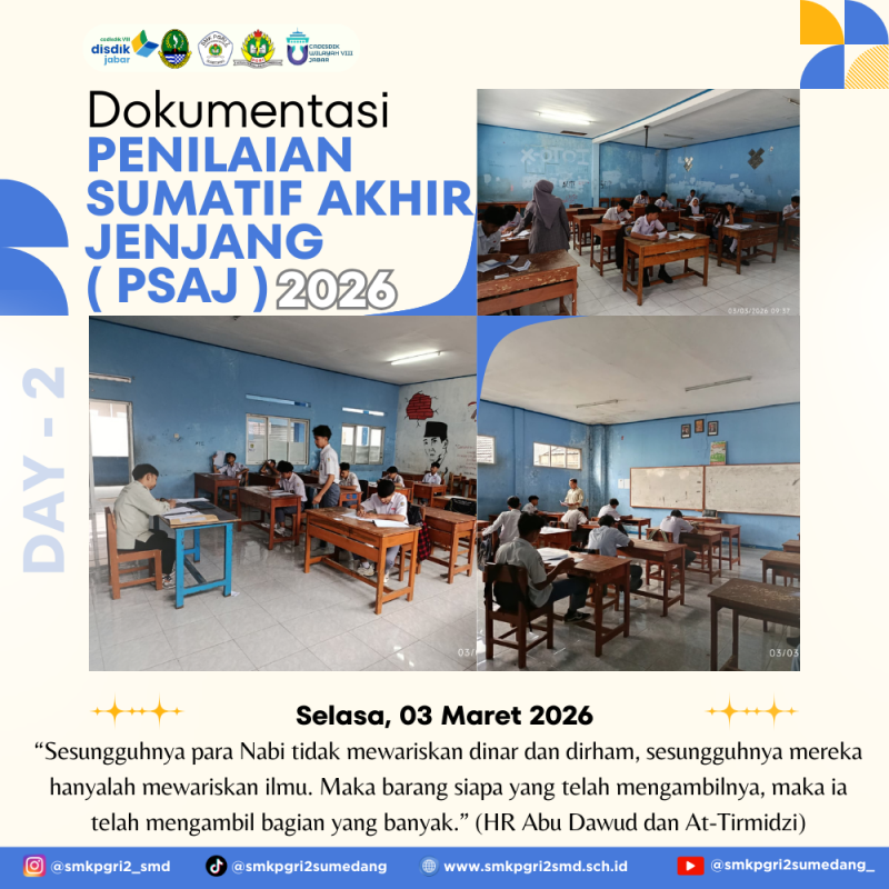 SUMEDANG – Pelaksanaan Penilaian Sumatif Akhir Jenjang (PSAJ) Tahun Pelajaran 2025/2026 di SMK PGRI 2 Sumedang memasuki hari ke-2 pada hari ini, Selasa, 03 Maret 2026. Para siswa kelas 12 kembali hadir di ruang-ruang ujian dengan penuh semangat untuk menuntaskan rangkaian evaluasi akhir masa studi mereka.