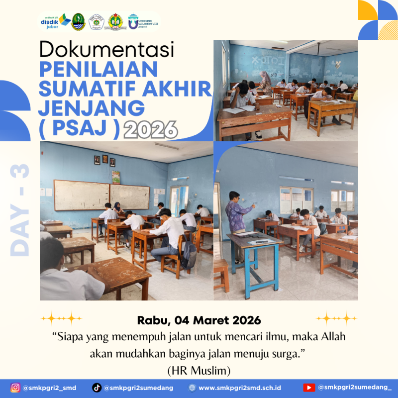 SUMEDANG – Memasuki hari ketiga pelaksanaan Penilaian Sumatif Akhir Jenjang (PSAJ) Tahun Pelajaran 2025/2026, suasana di SMK PGRI 2 Sumedang terpantau tertib dan kondusif. Ujian yang berlangsung pada Rabu, 4 Maret 2026 ini merupakan tahapan krusial bagi para siswa kelas XII untuk menuntaskan masa studi mereka di jenjang sekolah menengah kejuruan.