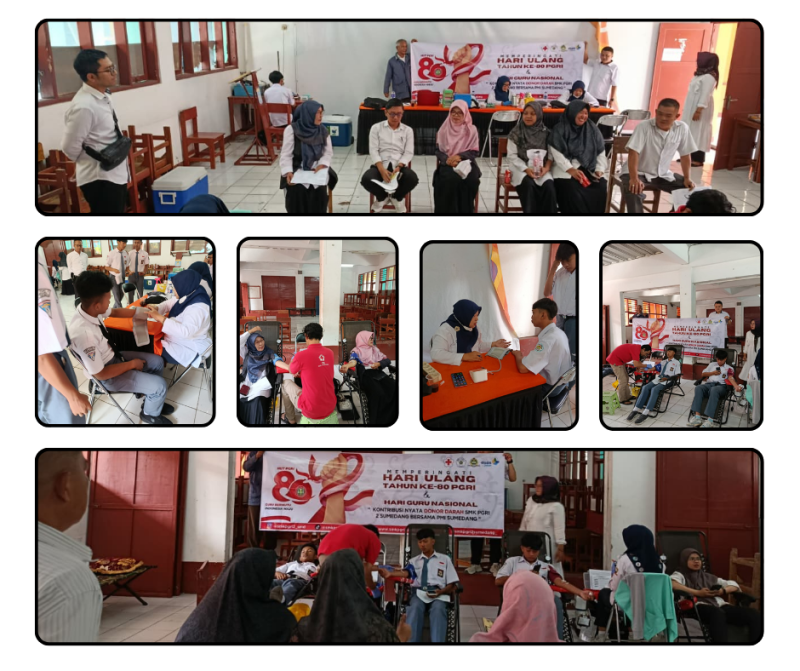 Dalam rangka memperingati Hari Ulang Tahun ke-80 PGRI dan Hari Guru Nasional Tahun 2025, kegiatan donor darah ini menjadi bagian dari rangkaian program besar yang digelar PGRI dan PMI Sumedang. Banner peringatan HUT PGRI yang terpampang di aula semakin menambah semangat peserta untuk ikut berkontribusi. Petugas medis dari PMI tampak sigap dan profesional dalam melakukan pemeriksaan tekanan darah, hemoglobin, serta memastikan kondisi kesehatan pendonor.