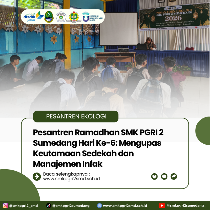 SUMEDANG – Memasuki pekan kedua, rangkaian kegiatan Pesantren Ramadhan 2026 di SMK PGRI 2 Sumedang berlanjut pada Senin (02/03) dengan fokus utama pada pemahaman mengenai kepedulian sosial melalui zakat dan sedekah. Materi hari ini dirancang agar siswa tidak hanya memahami teori, tetapi juga mampu mengelola dana sosial secara mandiri.